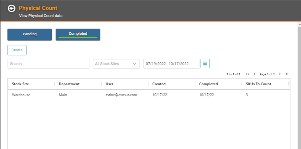 When you click on the Physical Count tile, you arrive at the Physical Count page where you can Create a new Physical Count, access current, Pending Physical Counts, or view your Completed Physical Counts.