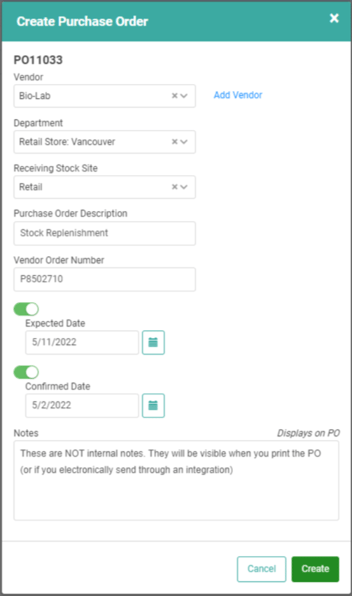 In the Notes and Details box, you can enter notes which will appear on the PO, visible to the Vendor, and internal notes which are only visible to you and your users.