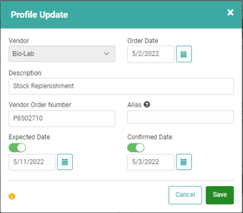 You cannot change the Vendor name, but you can add a description for the order, add an alias and Vendor Order Number for the Order, and set the Expected and Confirm Dates. Once you’ve entered the information, click