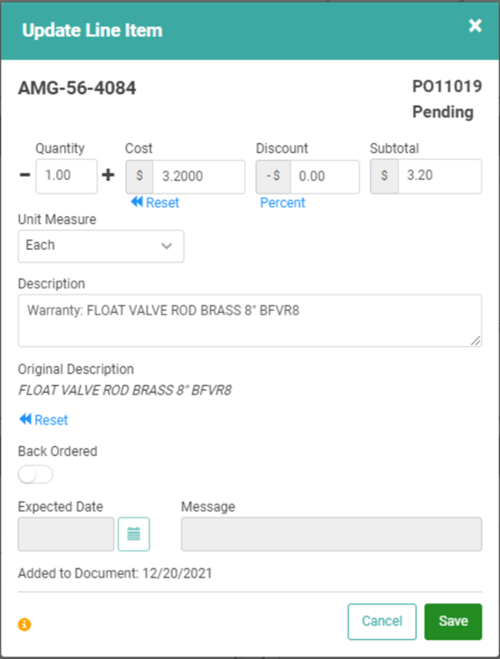 For non-Serialized SKUs, you can use the Quantity field to update the quantity you wish you order. For this PO only, you can change the Cost, apply a Discount, including a Percentage Discount, and view the Subtotal after applied Discounts. The UOM can be changed, as well as the Description.