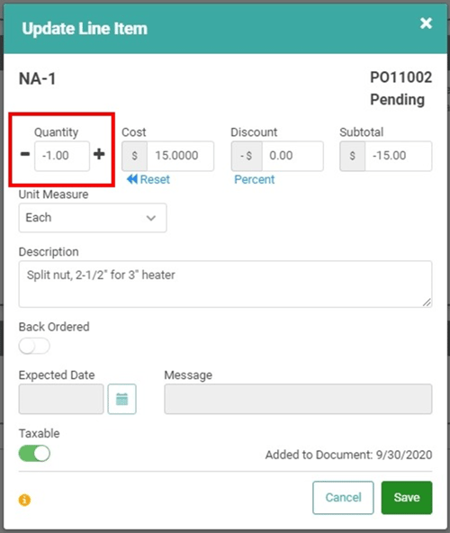 The information will update to reflect negative amounts. Once you’re done, click Save. The PO will reflect a negative quantity and amount.