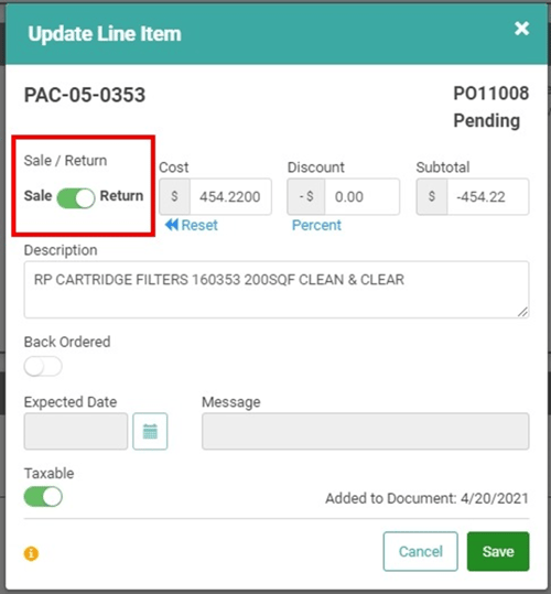 When a SKU is Serialized and needs to be returned, the process is slightly different. Just as you cannot manually change the quantity on a Serialized SKU to add additional SKUs to a PO, you cannot update the quantity to be negative. Instead, you can toggle the Sale button to Return. On the Serial line item, click Actions and Update, then toggle the button to Return.