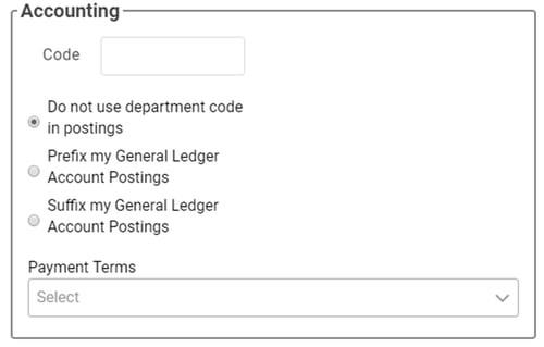 3. Scroll and enter the Accounting information. (Make sure you’ve set up your Payment Terms before entering this information.) This Code allows you to append a Code to General Ledger posts to quickly identify that post as belonging to the specific Department. Example: Service Department Code is SER. There’s a GL post to Account 2002 from the Service Department. It would show on the GL as SER2002 or 2002SER.