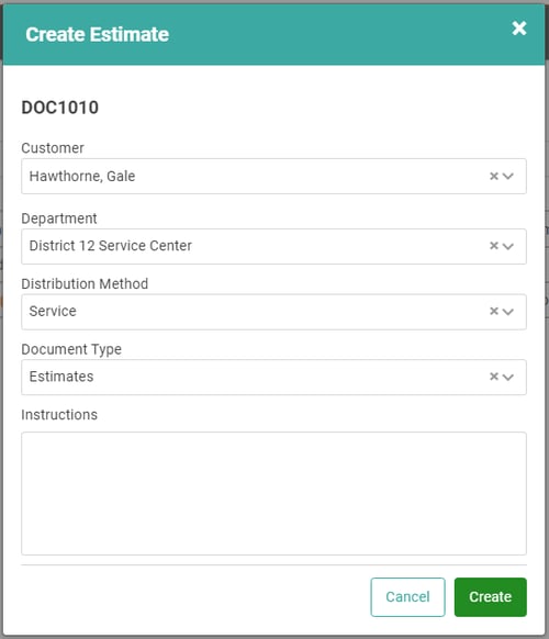 Estimates appear on a larger Documents Search page where you can quickly access your Sales Orders and Work Orders as well. There are fields to filter your view by Document Type, Status, Department, and Date Range.