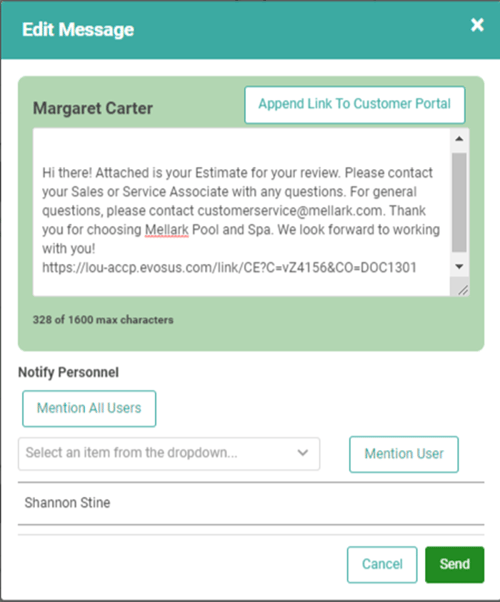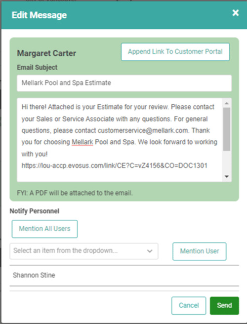To send an Email or Text message of the Estimate to your customer, click the Message button. The email is created/managed through Setup / Configuration / LOU Integrations / Email Messaging. Depending on the Customer Message Preferences, when you click the Message button on the Estimates Profile, LOU will open a pop-up box with the message you’ve configured as well as a link directly to the Estimate.