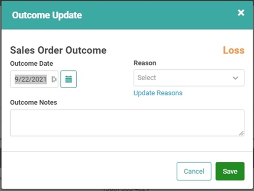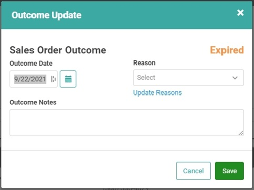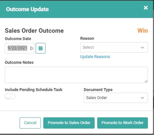 You must select a Reason. You can add Outcome Notes, toggle the Include Pending Schedule Task on, and select the Document Type. Then you can select whether to promote to a Sales Order or a Work Order.