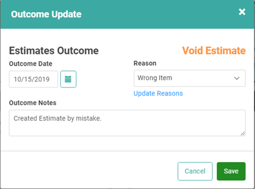 If you want to Void the Estimate rather than marking it as a Win or Loss, you can click  and enter an Outcome Reason and relevant notes.