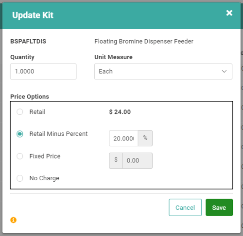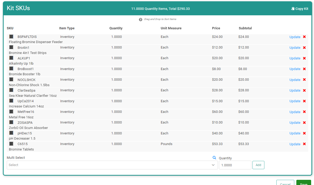 Kits can be created for any group of products you typically sell together. This might be a big-ticket item like a spa paired with a cover, steps, and the various parts and pieces required to install everything together. You might also create a kit for smaller items like chemicals. Perhaps you want to sell a “Starter Kit” that contains all the chemicals and testing supplies needed for a new pool or spa.