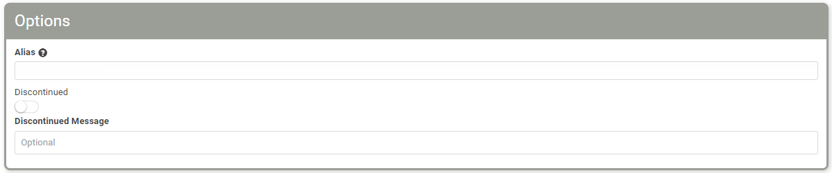- In Options, you can create an Alias. This is also where you’d come to edit the SKU and mark it as Discontinued if you decide not to offer it anymore.