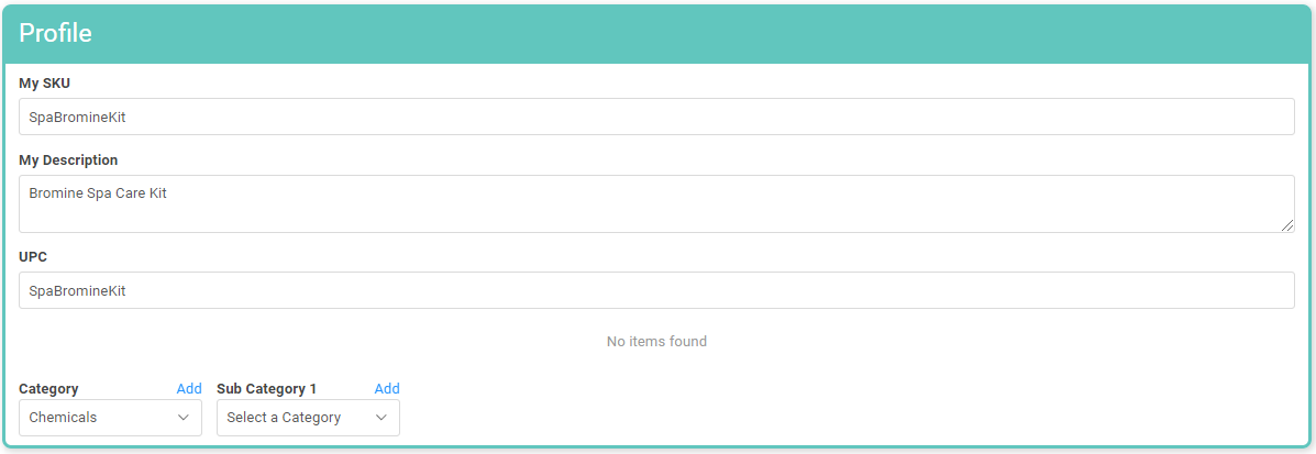 - Fill in the information in the Profile. Give your Kit a SKU, Description, UPC if you want, and Category.