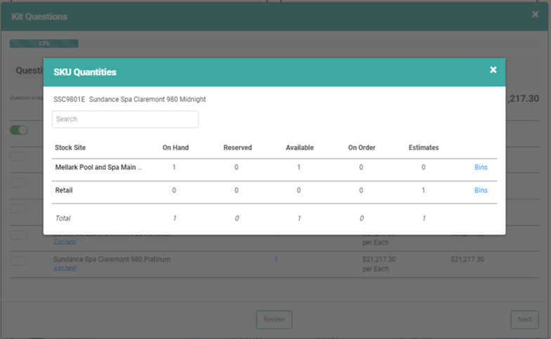 - Each Answer (SKU) will show a link below it indicating the number of that SKU currently on hand. Click the link to open a SKU Quantities pop-up that will break out Stock Site information for that SKU, including whether the quantity is On Hand, Reserved, Available, etc
