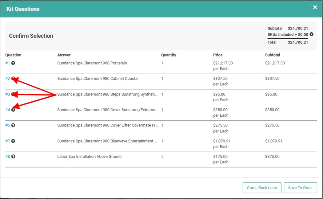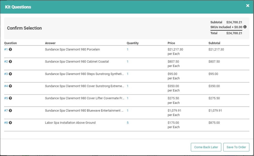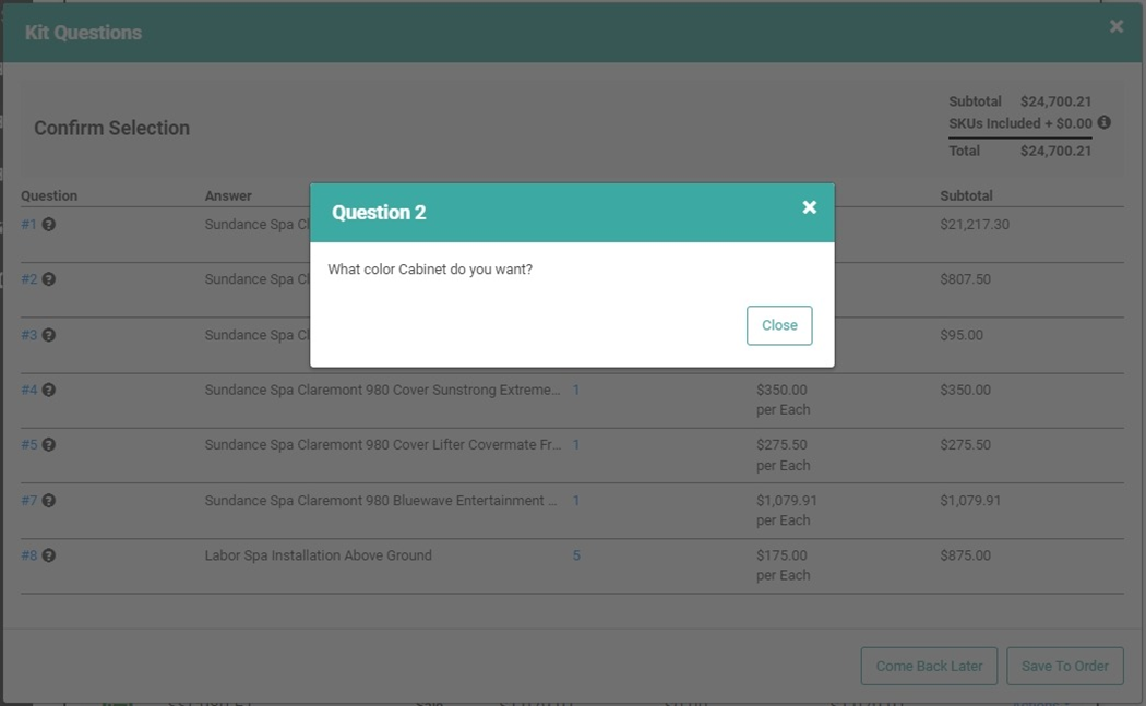 This Review also allows you to Save to the Order if you’re ready to move on or to click Come Back Later to save progress on the Kit Questions in the event you need to go do something else and come back. Come Back Later saves your progress.