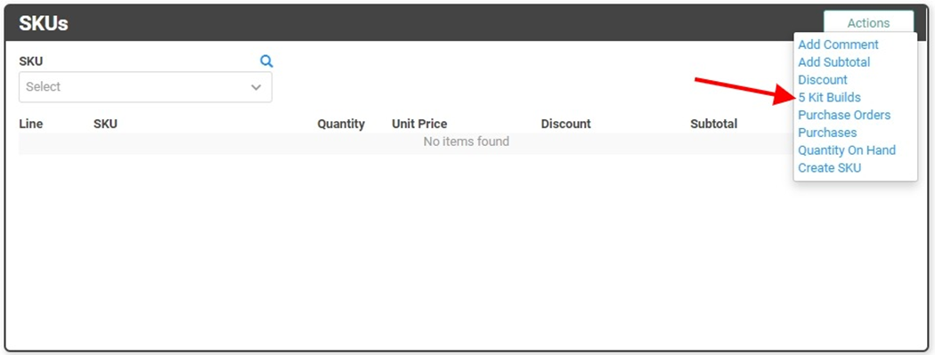 Click the Actions link on a SKU line item to perform specific actions for the Kit SKU on the Order.