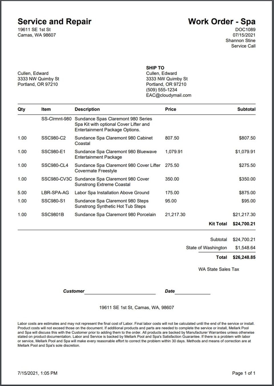 Once you’ve created the Kit SKU, you’re ready to use it on Orders. When you add a Kit to a Sales or Work Order, each individual SKU will automatically list out on the Order underneath the Kit SKU.