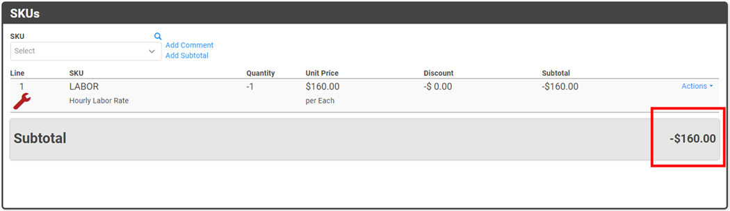 The SKU Type icon will change to red and the Subtotal will reflect a negative amount.