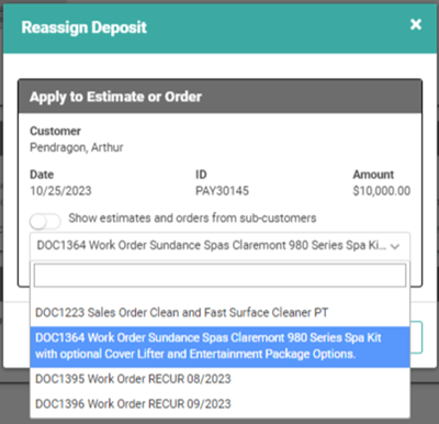 - Reassign Deposit: Reassigning the deposit will transfer the Deposit from being associated with one Order to being associated with a different Order. This does not create an On Account credit for the Customer and does not change the payment from a Deposit.