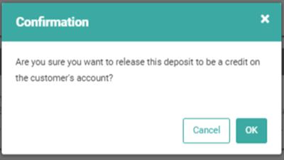 - Release Deposit: Releasing the deposit will move the deposit payment from a Deposit to a Payment On Account, creating a credit on the Customer’s Account Record. This amount can then be applied to any future Invoice(s) until the credit is reduced to zero.
