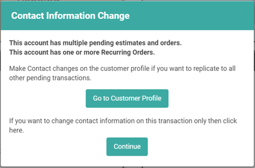 If you select Continue, the updates you make will be on this Order only and will not update Customer Profile or additional pending Documents.