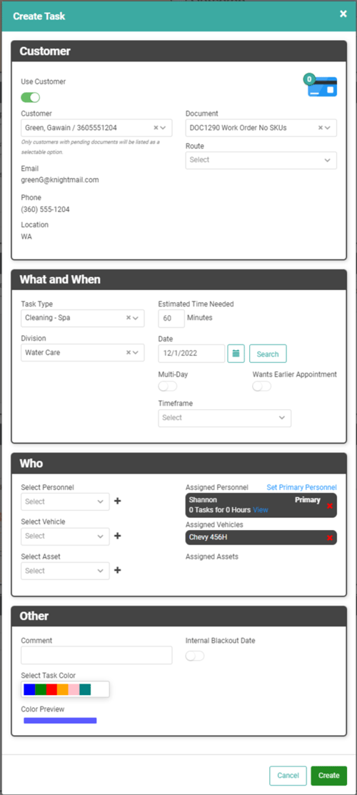 Most of the information for the Task will be prepopulated. You can add and update information to correctly Schedule the Task.