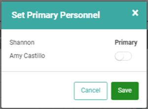 - The first person you assign to the Task will be the Primary Personnel and additional Personnel will be listed as Helper. To change who is listed as Primary, click the Set Primary Personnel link and click the toggle next to the Personnel you want to set as Primary.