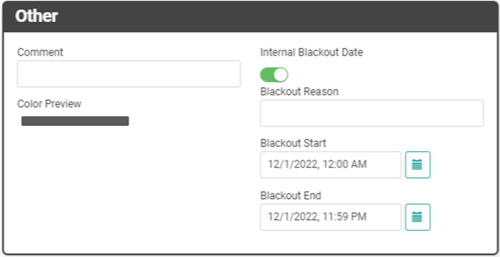 - Other: This whole box is optional. Leave a Comment, select the color the Task will display on the Calendar view, and set an Internal Blackout Date. If you want to ensure this Task is not Scheduled during a specific Date(s), you can provide a Blackout Reason and use the Start and End Date fields to configure the Date or Date Range.