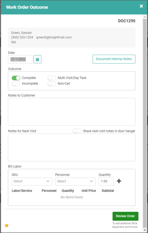 a window will pop up, allowing you to provide Outcome details, including Internal Notes, Notes to the Customer, Notes for Next Visit, and Bill Labor not included on the SKUs for the Order.