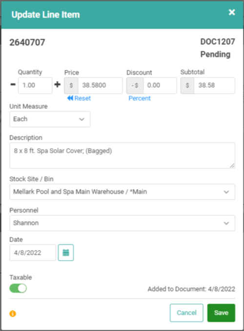 - Date: This is the date the document was created. Below that Date is the Description. The default description is the first SKU on the Order. If you have used the Override Description field in the document, that Description will display here.
