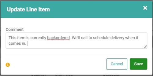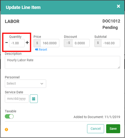 - The Update Line Item window will pop up. In the Quantity field, add a minus sign (-) before the number to make the Quantity negative.