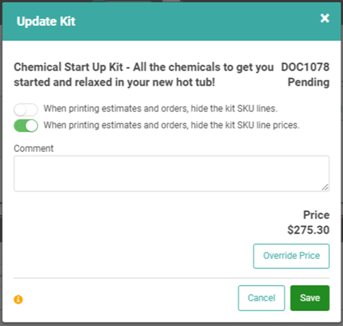 - Update Kit: Click to override the Kit Price for this Order only or to hide SKU line items or SKU line item prices on printed documents. They will still appear on electronic documents.
