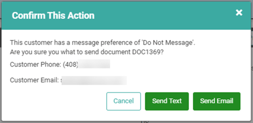 If your Customer has Do Not Message toggled on their profile, clicking the Message button will give you a warning, letting you know that they Customer’s message preference is ‘Do not Message’. It will provide the Customer’s contact phone number and email and allow you to click Send Email, Send Text, or Cancel out of the pop up and return to the Order. If you select either Send Email or Send Text, LOU will bypass the Do Not Message instruction and send the Email or Text.