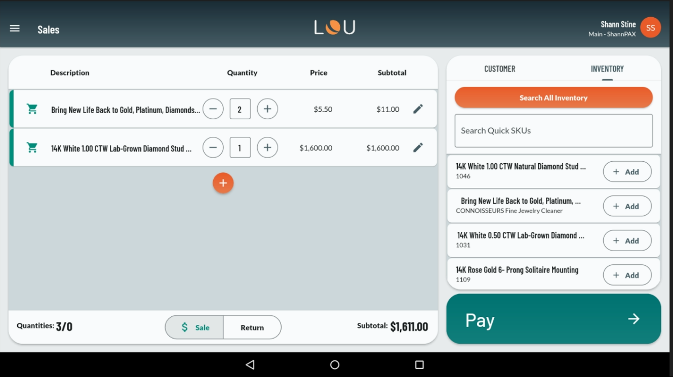 - On the Sales Transaction screen, process the transaction as usual. You can add additional SKUs or click Pay to process Payment and complete the transaction.