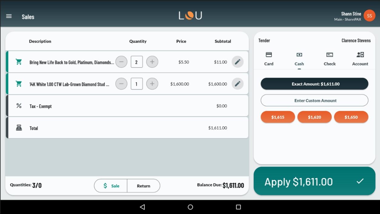 - With Payment Method and Tender Amount selected, tap Apply to complete the Transaction.