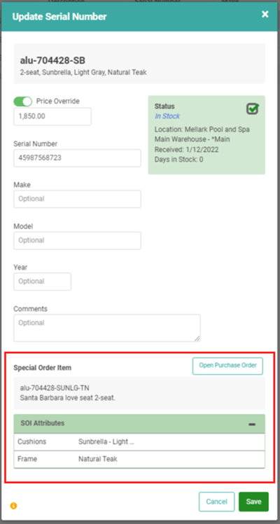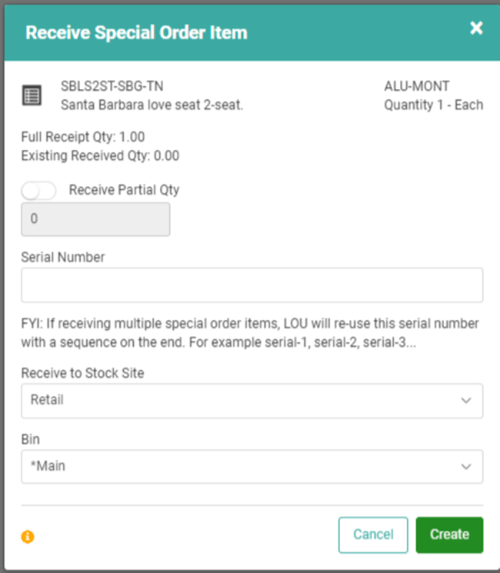 - On the Receive Special Order Item pop-up, enter the Serial Number (using Customer Name is a great idea!)