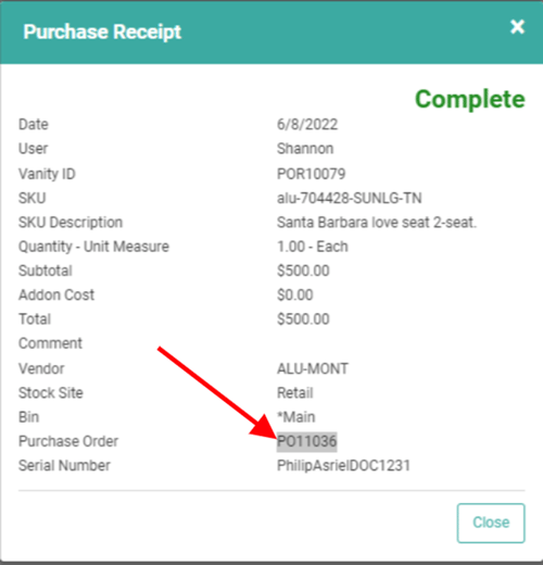 As soon as you click Create, the item will be received into inventory, removed from the Receive Inventory screen, and the SOI SKU will be replaced on the Order with the Serialized SKU you just received.