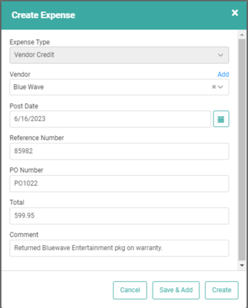 - Choose the Vendor from the dropdown and enter a Reference Number, the PO number, the Total credit received, and an optional Comment.
