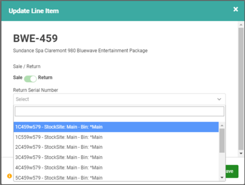 In the event you’re returning a Serialized SKU, the Receive Inventory screen will ask you to select which Serial Number in your Inventory you are returning.
