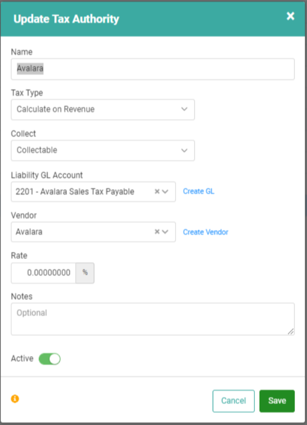 - Enter the necessary information   - Avalara Integration If you’re going to be using Avalara, and you want this Tax Code to be calculated by Avalara, make sure to toggle Avalara Tax Code on. Remember not all Tax Codes will use Avalara for calculations. Speak with your LOU Onboarding Specialist and Avalara Specialist if you’re unsure.