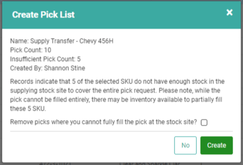 - You’ll receive a Create Pick List pop-up confirming the items you are adding to the Pick List and giving you info on what cannot be picked. You can check the box next to Remove picks where you cannot fully fill the pick at the stock site? if you want to skip those SKUs for the Pick List.