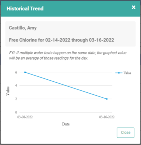 You can click the Historical Trend link to see a graph, indicating a trend of all Water Tests on the Customer’s Profile.