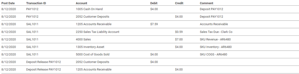 - The $4.00 deposit on the order was removed from the Customer Deposit Liability account and posted to Accounts Receivable.