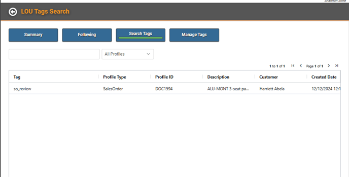 - LOU Profiles: Select the Profile to be taken to the Search Tags page filtered for that Profile. All Profiles of that type that contain a Tag of any kind will be listed.
