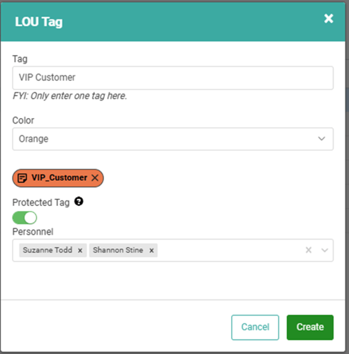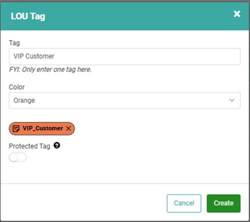 When you create a Tag, you can give it a name limited to 25 characters. You can designate it with a color from the dropdown and determine whether the Tag should be Protected. Once you are satisfied, click Create. The Tag is now available for use.
