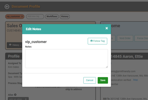 You can click on a Tag on a Profile to open a pop-up that allows you to enter a note associated with that Tag for that Profile and to follow the Tag.